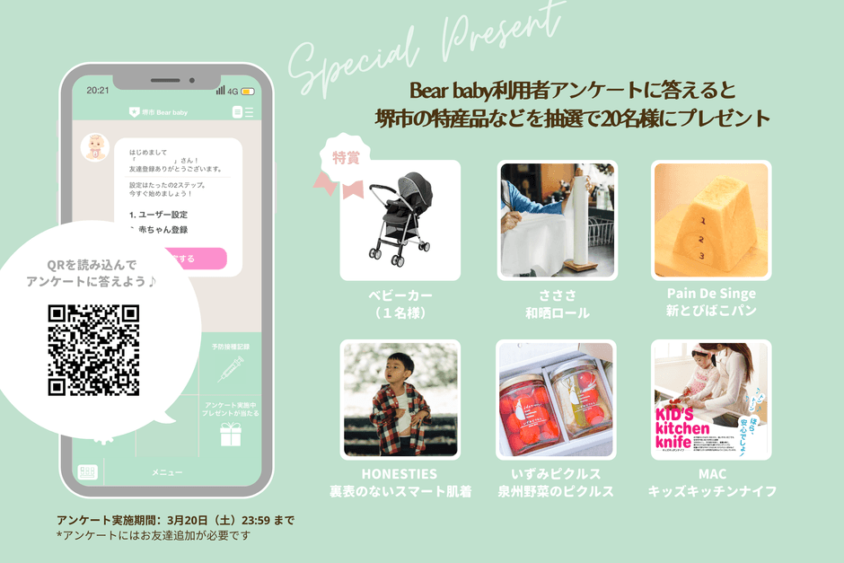 「Bear baby (ベアーベビー)」の試験運用中である2月1日(月)より、利用者の皆様にアンケート調査を行っています。より、堺市の子育て世代寄り添ったサービスを提供するため、LINEトーク画面のメニューからアンケートにご協力ください。