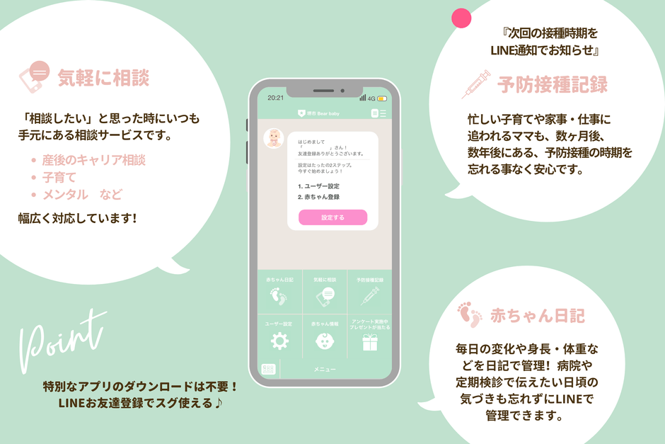 チャットメッセージでは堺市の子育てに関する「定期検診」「子育て広場」などの子育てに役立つ情報が配信されます。また、下記に紹介する機能は24時間好きな時間にアクセスすることができます。
