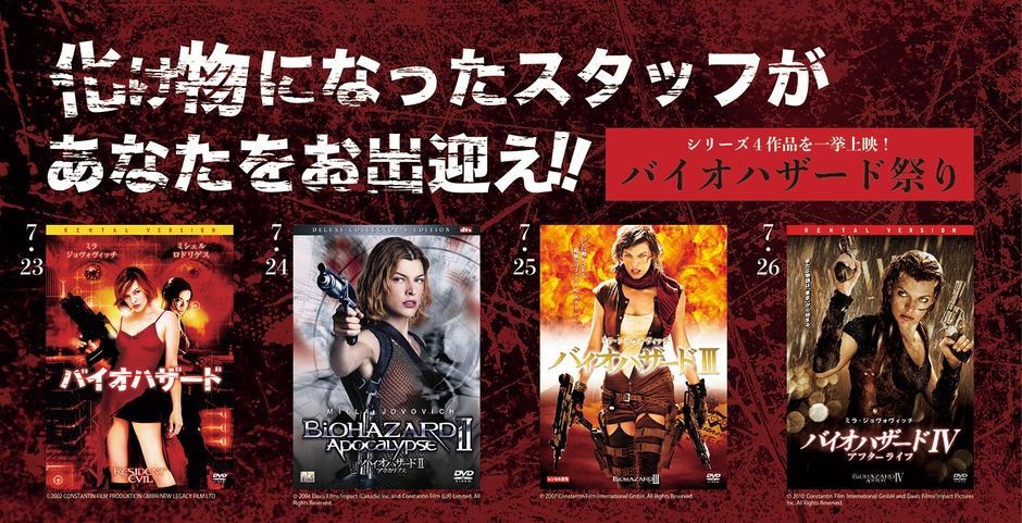 DRIVE IN PARK CHIBA実行委員会は、クルマで楽しむエンタメパーク「DRIVE IN PARK CHIBA」(千葉県千葉市美浜区高浜7-2-2 稲毛海浜公園 第2駐車場内)において、7月23日(木祝)~26日(日)の4日間、パーク内のドライブ・イン・シアター「STARLIGHT CINEMAZ」での映画の上映にあたり、化け物に扮したスタッフが来場客を“おもてなし”する特別企画上映を実施します。上映作品は上映日ごとにそれぞれ「バイオハザード」「バイオハザードII アポカリプス」「バイオハザードIII」「バイオハザードIV アフターライフ」の4作品。