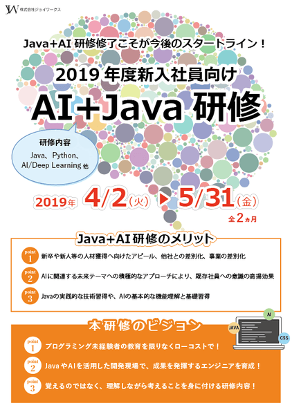 株式会社ジョイワークス(所在地:東京都渋谷区、代表取締役:高蓋 和秀)は、新入社員向けにAIをカリキュラムに加えたオープン研修で業界初の「Java+AI研修」を提供開始いたします。当社ではもっと身近にAIの学習をしていただくために、総務・人事部門の新入社員研修を選定するご担当者、指導役エンジニアを対象に無料プレセミナーを2019年2月6日、13日、20日、27日に東京・渋谷で開催いたします。