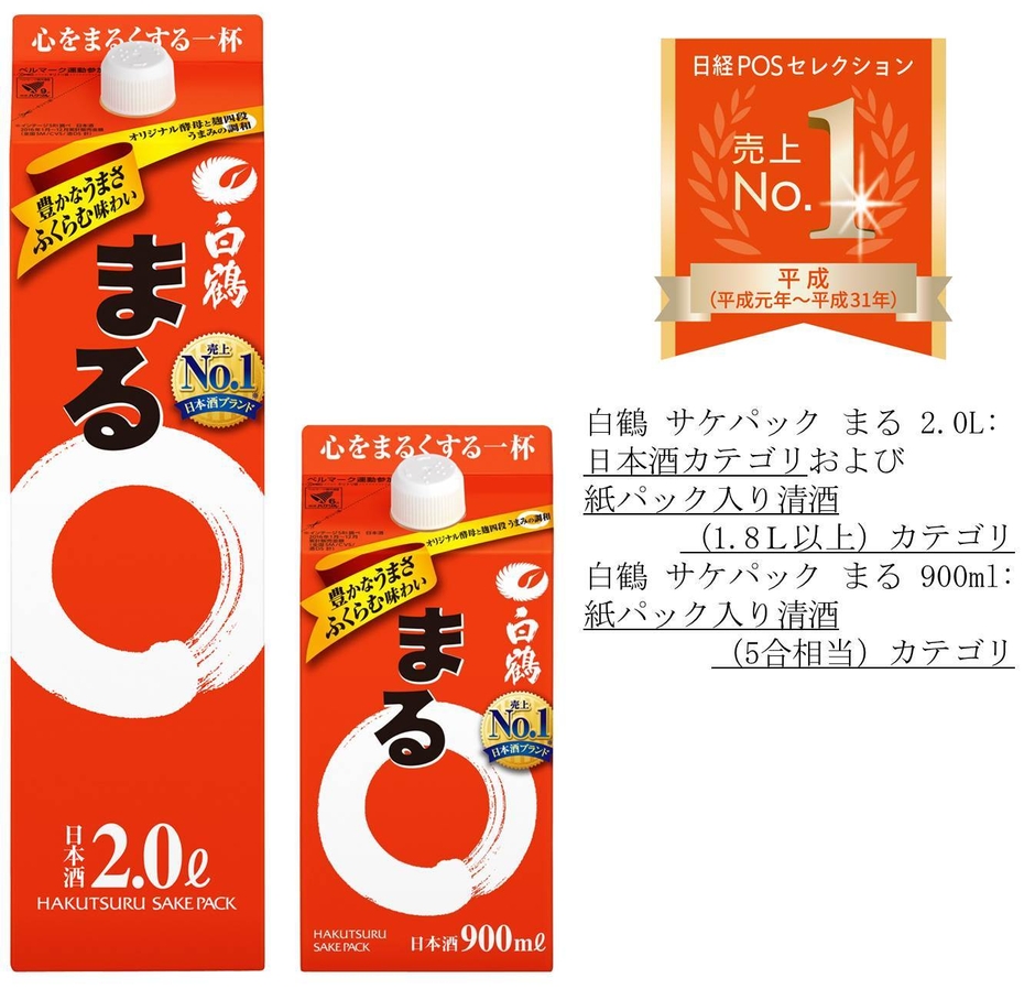 白鶴酒造株式会社(本社:神戸市、代表取締役社長:嘉納健二、資本金:4億9,500万円)の「白鶴 サケパック まる 2L」は、日経POSセレクションの“日本酒”と“紙パック入り清酒(1.8L以上)”の2カテゴリで、「平成売上NO.1」に決定しました。また、「白鶴 サケパック まる 900ml」は、“紙パック入り清酒(5合相当)”カテゴリで、「平成売上NO.1」に決定しました。