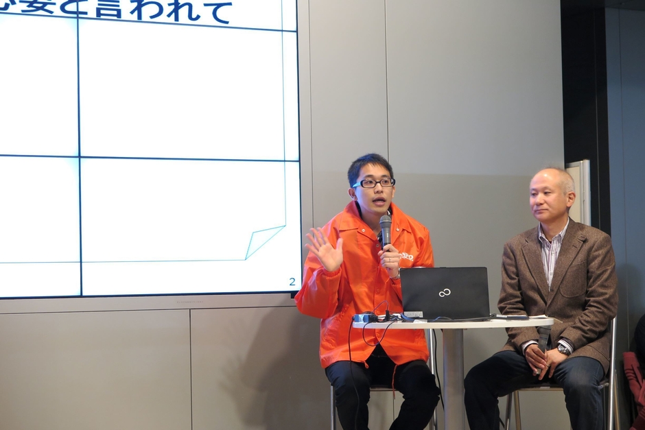(左)ステージで地震保険の必要性を紹介する当支部小島職員 (右)財務省北海道財務局の鈴木氏