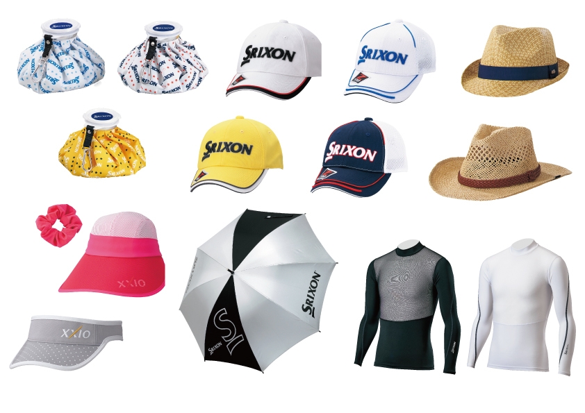 真夏のプレーには必要不可欠な冷却用のスリクソンオリジナルアイスバッグ(数量限定)や、水に浸けて使用することで涼感効果が高まるキャップ類、快適なプレーをサポートするアンダーウエア、接触冷感機能の付いたソックス、毎年好評のハットやアンブレラをラインアップしています。