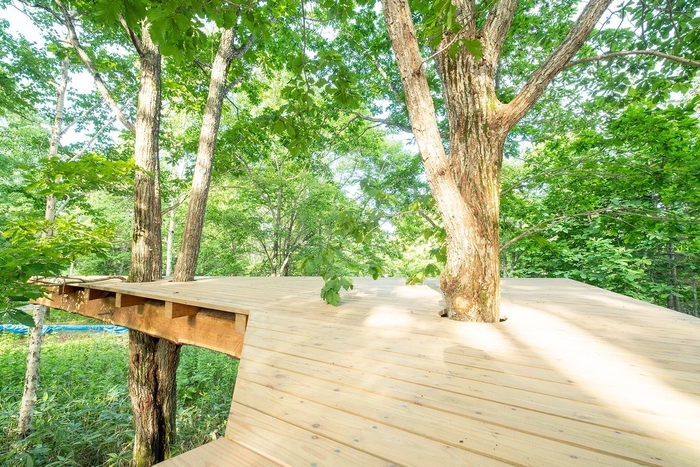 この「大雪山大学」プロジェクトの一環として製作したツリーテラスが、「鳥の目になるテラス」です。プロジェクト監修・ディレクションに木野哲也氏、プロジェクト監修・プロデュースに畠中秀幸氏、実施施工・デザイン設計に木こり集団outwoodsを起用し、鳥が木の枝にとまっているのと同じ目線を体感できるツリーテラスをコンセプトに製作。地元上川町のカラマツの木を伐採するところからスタートし、生い茂る木々と共存するように一つ一つ組み立てました。