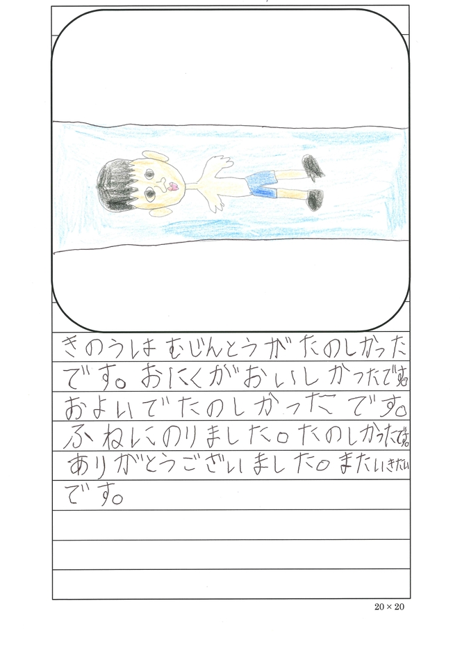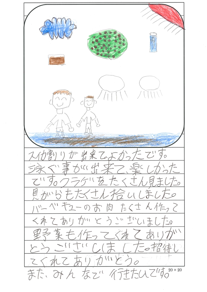参加者たちは夏の日差しを浴び、海水浴やバーベキュー、すいか割りなど年に一度の海水浴を楽しみました。また海水浴の終わりには、児童の代表者より招待のお礼の手紙が読み上げられ、みんな笑顔で無人島を後にしました。本活動は、当財団が掲げる基本方針「子どもの健全育成」の一環として、子どもたちの個性や能力を発揮できる場を提供することを目的に実施したものです。