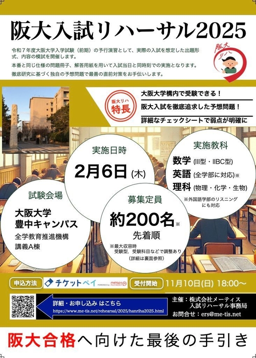 株式会社メーティスは、2025年2月6日(木)、大阪大学 豊中キャンパスにて「阪大入試リハーサル」を開催します。本番同様の試験環境で、全学部の数学・英語および理科を完全カバー。解答用紙や時間割も本番に即した形式で実施し、緊張感を体感しながら実力を最大限発揮できる訓練の場を提供します。