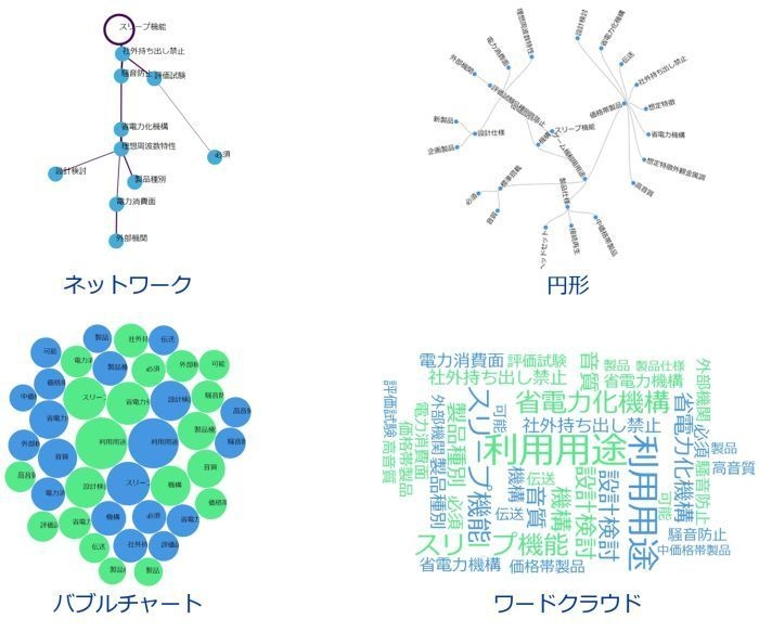 重要語句同士の関連性やAIで分類した重要語句の分類情報をさまざまな指標で「見える化」しており、企業内に埋没しているドキュメントの掘り起しを支援します。
