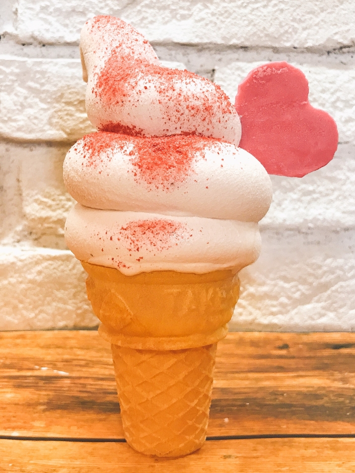 新潟県産の越後姫を使った自家製のピューレを新鮮なミルクと合わせたオリジナルのソフトクリームに、フリーズドライにした苺の粉末、ハート形の苺味のチョコをトッピングした、いちご好きにはたまらない苺×苺×苺な当店限定のソフトクリームです。