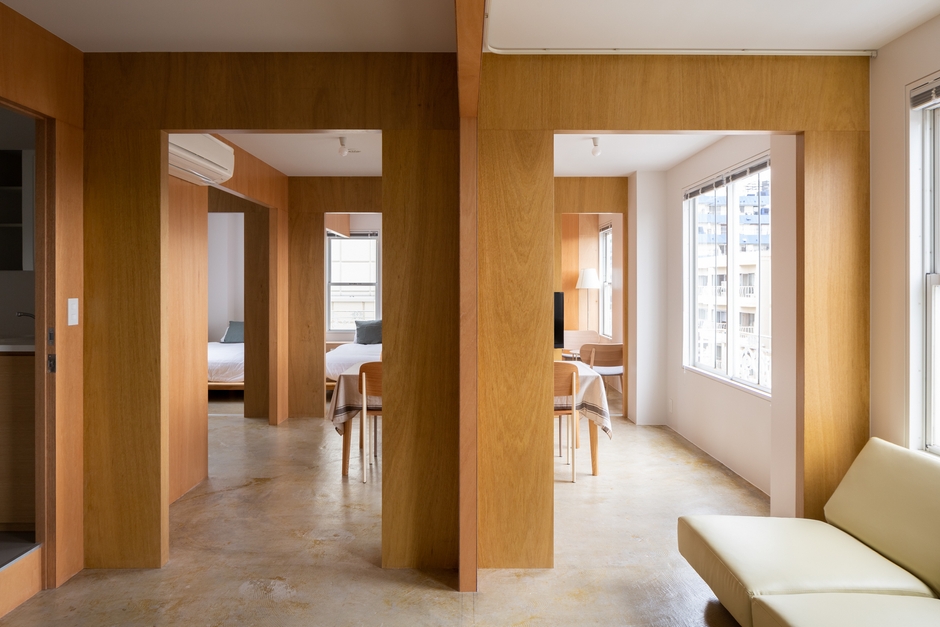 [4階]“続き間”をコンセプトに、柱型の間仕切りによって小さな空間が連なっており、空間にフレキシビリティがある客室