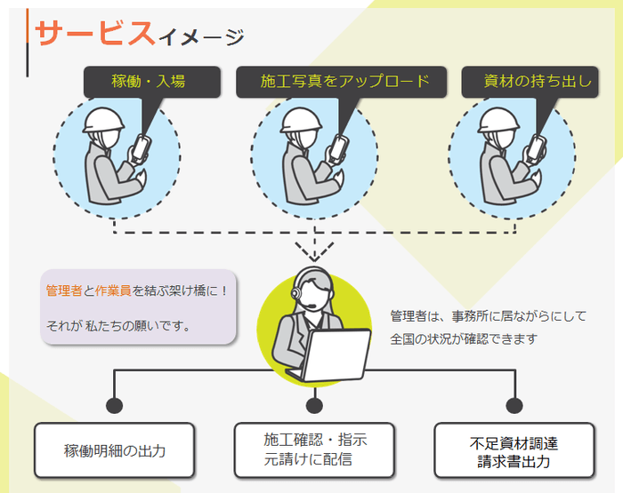 本システムは、これまで紙ベースで行われていた作業者の一日の報告や資材の持ち出し申請、安全面の周知などをシステム化して作業者からの報告をリアルタイムに管理者まで報告することで、施工確認・指示、不足資材の調達、元請けへの配信など状況に応じたスムーズな対応が可能となります。