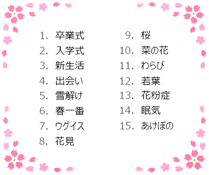 (ちなみに、4位は「花粉症」、5位は「新生活」、6位は「卒業式」でした。)