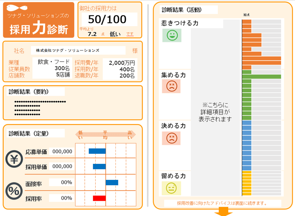 ・診断結果は「採用力診断シート」として出力され、回答者へ納品される。