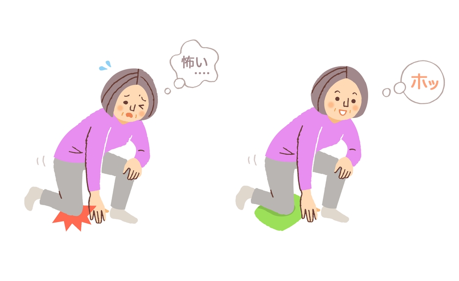ところが、手術に満足しても、床生活に欠かせない「ひざまずき動作」を避けてしまうことで、手術後の生活に不自由さを感じている人が少なくないことも近年わかってきました。人工膝関節置換術後6か月以上の定期健診時点で92%以上の人はひざまずき動作が出来るのにも関わらず、実際に日常的にひざを床についている人は21%に留まったという調査結果があります。ひざを床につかない、もっとも多い理由は意外にも痛みやしびれなどの肉体的要因ではなく、不安感や恐怖感などの心理的要因でした。※3そこで、こういった不安の解消や膝への負担軽減を目的として「ひざまずきパッド」を開発いたしました。