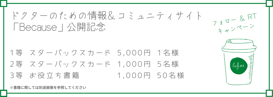 医師向け情報&コミュニティサイトBecauseは2020年6月20日に【ドクター応援キャンペーン】スターバックスカードプレゼントを開始いたしました。