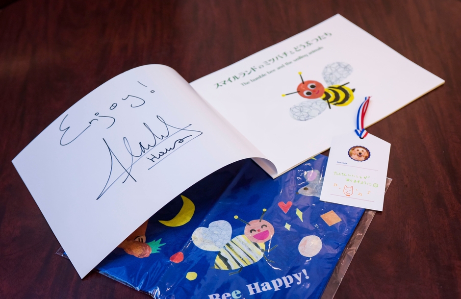 オリジナル絵本の「スマイルランドのミツバチとどうぶつたち」を子どもたち全員にいただき、気持ちのこもった贈り物を本当にありがとうございます。きっと子どもたちも絵本の中のスマイルランドに入り込んで、楽しい時間を過ごせると思います。また、子どもたち一人ひとりに心のこもったメッセージを書いていただいた社員の皆様に感謝いたします。