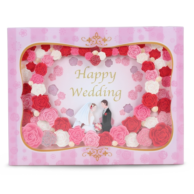 上部のボタンを押すと、結婚行進曲が流れ、正面が光ります。メッセージは、商品の背面に収納されており、商品とメッセージ台紙両方を並べて展示することができます。