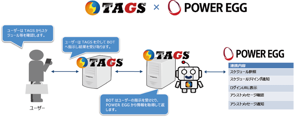 法人向けビジネスチャット「TAGS」は社内外のコミュニケーション促進だけでなく、BOT機能を活用することにより、時間を選ばず、BOTによる即時回答(情報伝達)を実現することができます。これまでPOWER EGGの各機能から操作していた登録作業をチャットから行うことができ、また新着や登録変更などの通知もチャットへ自動送信され、業務のスピードアップ化とシンプル化を実現します。