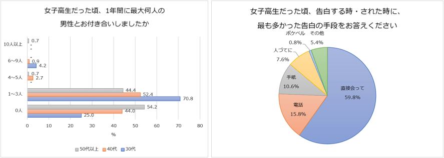 また、告白する方法について尋ねてみたところ、最も多かったのは「直接会って」(59.8%)となり、続いて「電話」(15.8%)、「手紙」(10.6%)という結果に。回答数の多かった順番は世代問わず同じ結果でした。