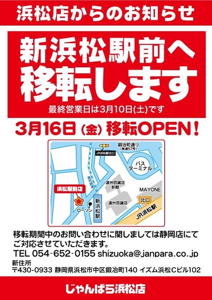 スマホ・PC等の買取販売店「じゃんぱら浜松店」が3月16日に 「じゃんぱら浜松駅前店」として移転リニューアルオープン!