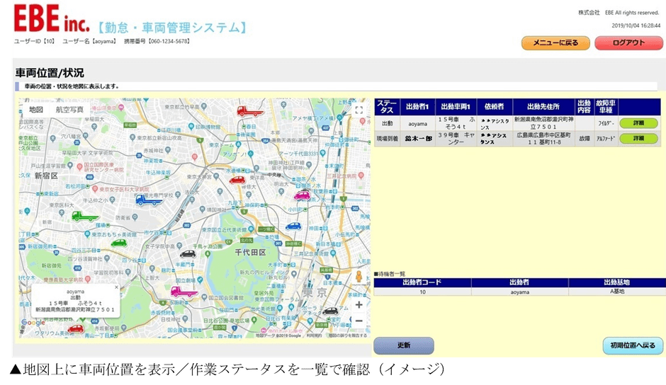 テックファームグループで自動車アフターマーケット事業を手掛ける株式会社EBE(所在地:東京都千代田区、代表者:代表取締役社長 千原信悟、以下:イーバ)は、災害時の迅速な道路復旧に貢献するため、ロードサービス管理システムの必要性について啓蒙活動を強化し、拡販に努めます。システムは、自走不能になった車両をレッカー移動させる際に作業隊員への指示出しや出動車両の位置把握などを効率化するものです。2019年10月には、台風19号による水没被害に遭った長野県でシステムの無償貸出を行い、70台以上の車両移動を支援しました。