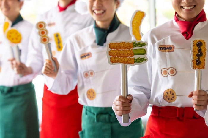 「なにわラグジュアリー」を体感できる都市ホテル「OMO7大阪(おも) by 星野リゾート」は、2022年12月1日~25日の期間、串カツをテーマにしたイベント「串カツクリスマス」を開催します。「串」にちなんで94本の串カツが飾られた、高さ3メートルのツリーを囲みながら、串カツモチーフの楽器で奏でられるクリスマスソングの演奏が楽しめるイベントです。さらに、串カツに見立てたチーズケーキやガトーショコラなど全5種の串スイーツも提供します。