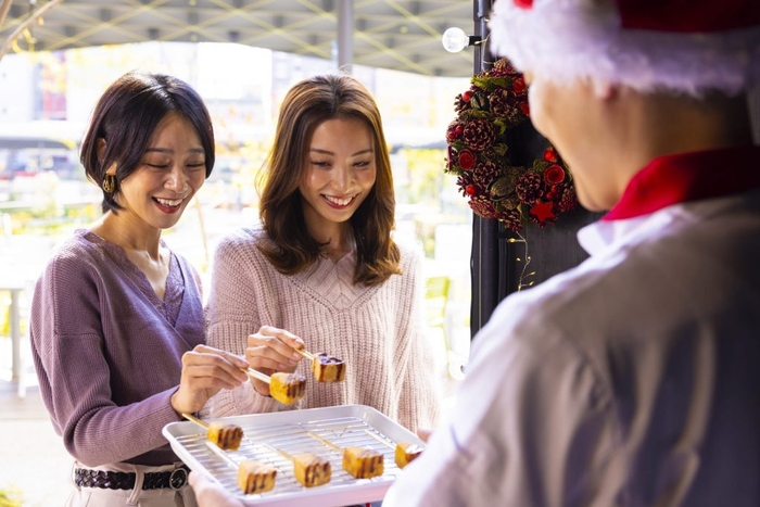 本イベントをさらに盛り上げるのは、串カツを愛してやまないスタッフによって結成された「串カツアンサンブル」による生演奏です。串カツアンサンブルが身にまとう赤や緑のクリスマスカラーの衣装には、よく見ると串カツの刺繍が施されています。牛串、エビ、アスパラ、レンコン、玉子の5種の串カツをモチーフにしたオリジナルのトーンチャイム(アルミ合金製のパイプをたたいて共鳴させる楽器)を使って定番クリスマスソングを演奏。ひと味違った演出にクスっと笑っちゃうこと間違いなし! 揚げたてのバウムクーヘン串をふるまう屋台も登場するので、串を片手に演奏を楽しめます。