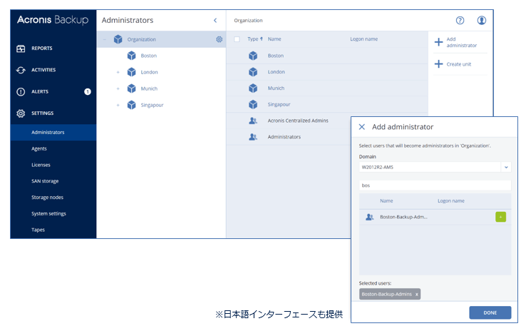部署や支店を含む大規模環境での管理者権限委譲。Active Directory統合により、普段利用しているアカウントやグループをそのまま使用可能。