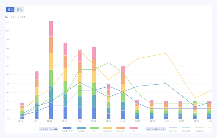 テレビCMとデジタル広告の視聴回数やリーチの推移を期間ごとに比較できるだけでなく、売上、Webコンバージョン、来店者数といった成果データを並べて表示。これにより、広告効果との相関関係を視覚的に把握することができます。
