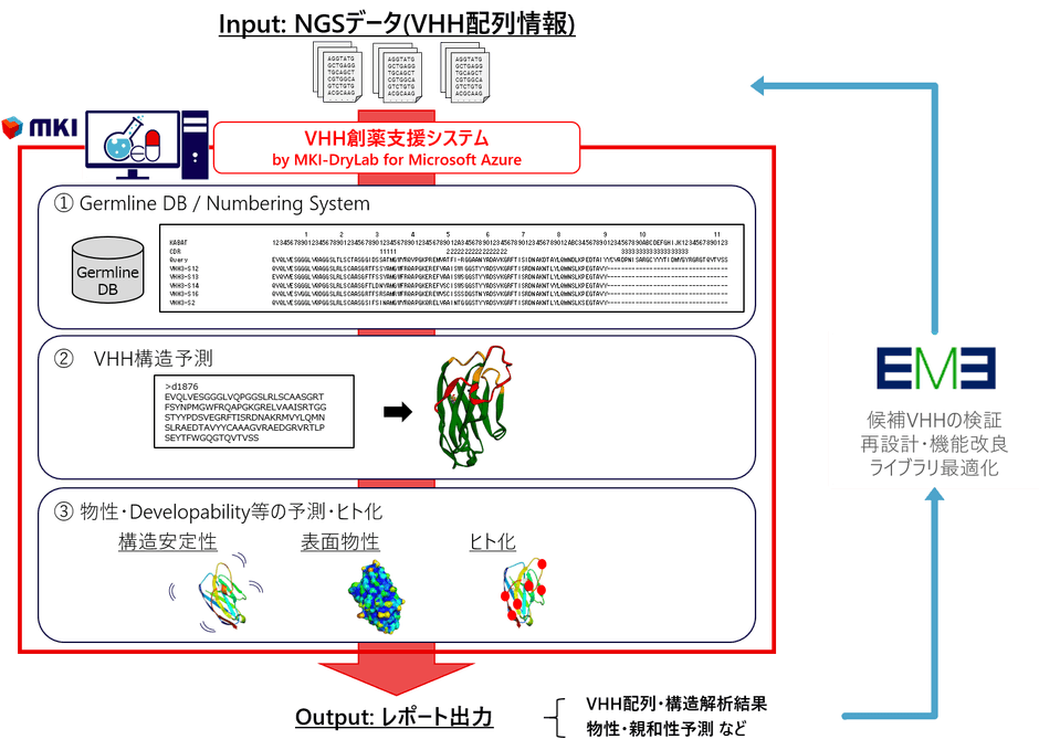 EMEは進化分子工学に基づくハイスループットスクリーニングをコア技術とし、ラクダ科動物(アルパカ)が産生する小分子抗体(以下 VHH)をはじめとした次世代抗体創薬に強みを持っています。EMEではVHHをスクリーニングするcDNAライブラリを保有し、そこから得られる大量の配列データ(NGSデータ)の解析にかかる時間と手間に課題を感じていました。そのため、解析の効率化とそれにかかるIT人材不足の解消が急務になっていました。MKIは本課題に対し、クラウド環境に計算基盤を構築するMKI-DryLabを通じて創薬環境のシステム化を実現し、これまで手作業で行っていたNGSデータ解析を自動化した結果、解析にかかる時間を80%以上短縮できました。また、AIを活用した創薬ターゲットに対して特異的に結合するVHHの合理的な選出も可能になりました。