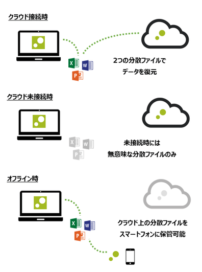PC内には、無意味なデータしか残りませんので、万一の盗難や紛失時も、情報漏えいを起こすことなく、また、発見時は、クラウドや外部ストレージの接続を再開するだけで、すぐにPCデータの利用が再開可能です。