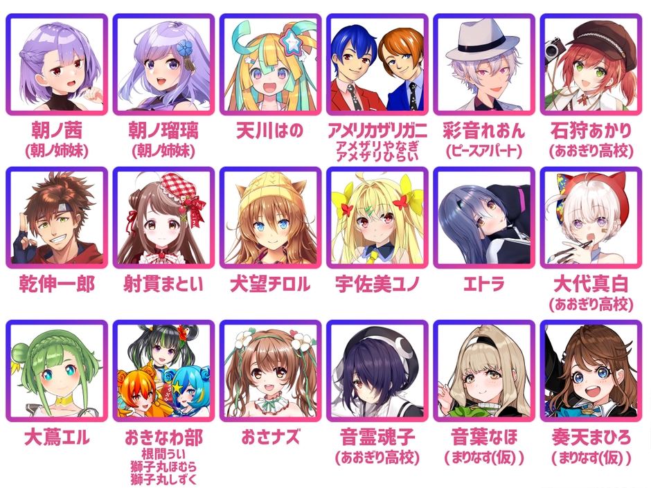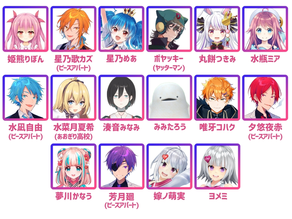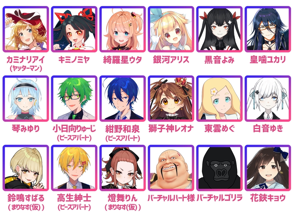 あおぎり高校(石狩あかり、大代真白、音霊魂子、水菜月夏希)、朝ノ姉妹(朝ノ瑠璃、朝ノ茜)、天川はの、アメリカザリガニ(アメザリひらい・アメザリやなぎ)、乾伸一郎、射貫まとい、犬望チロル、宇佐美ユノ、エトラ、おきなわ部(獅子丸しずく、獅子丸ほむら、根間うい)、大蔦エル、おさナズ、キミノミヤ、綺羅星ウタ、銀河アリス、黒音よみ、皇噛ユカリ、琴みゆり、獅子神レオナ、東雲めぐ、白音ゆき、花鋏キョウ、バーチャルゴリラ、バーチャルハート様、ピースアパート(彩音れおん、小日向りゅーじ、紺野和泉、高生紳士、星乃歌カズ、水凪自由、夕悠夜赤、芳月廻)、姫熊りぼん、星乃めあ、丸餅つきみ、水瓶ミア、湊音みなみ、まりなす(仮)(奏天まひろ、燈舞りん、音葉なほ、鈴鳴すばる)、みみたろう、ヤッターマン(カミナリアイ、ボヤッキー)、唯牙コハク、夢川かなう、嫁ノ萌実、ヨメミ