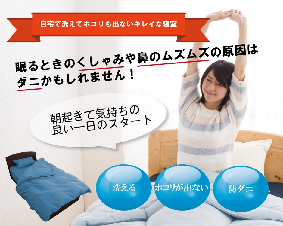 防ダニ掛け布団カバーはダニが通過できない高密度の生地だから薬剤を一切使うことなくダニを防ぎます。抜群の吸水・速乾性に優れた繊維なので吸水した水分を空気中に放出して乾いた状態をキープし、カビやダニを繋殖させない環境となります。