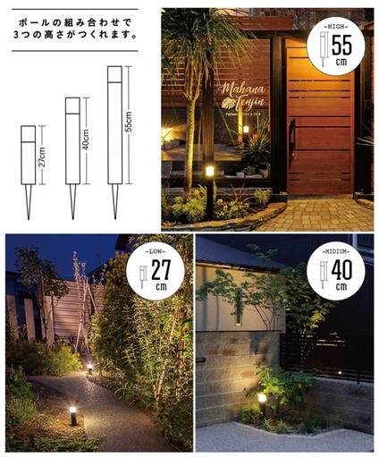 『間のひかり』は、ポールライト型の商品です。最大の特長は、2種のポールの組み合わせで高さが調節できることです。それにより、植物の成長や照らす対象物に合わせて1つのポールライトで3つの高さの光を演出できます。