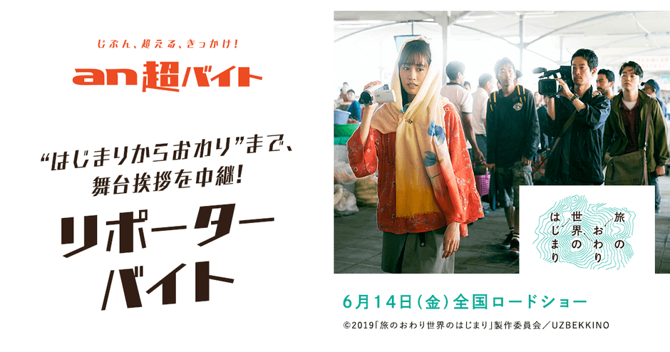 総合人材サービス、パーソルグループのパーソルキャリア株式会社(本社:東京都千代田区、代表取締役社長:峯尾太郎)が運営するアルバイト求人情報サービス「an」< https://weban.jp/ >は、思わず挑戦してみたくなるような「an超バイト」の新企画として、6月15日(土)に実施される映画『旅のおわり世界のはじまり』の公開記念舞台挨拶を、“はじまりからおわり”まで中継していただくリポーターバイトを2名募集します。主演の前田敦子さんにコメント撮りする機会もあり!また、映画に出演されたウズベキスタンの俳優・アディズ・ラジャボフや副首相も来場予定!異文化交流に興味がある方も是非チャレンジしてください!採用された方には日給5万円の他、非売品プレスシートも進呈されます。
