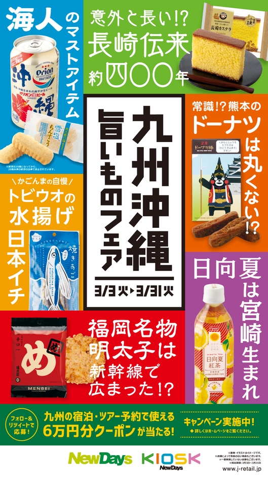 株式会社JR東日本リテールネット(本社:東京都新宿区西新宿/代表取締役社長:高橋 眞)が運営する「NewDays」「NewDays KIOSK」では、「九州沖縄旨いものフェア」を3月3日(火)より開催いたします。