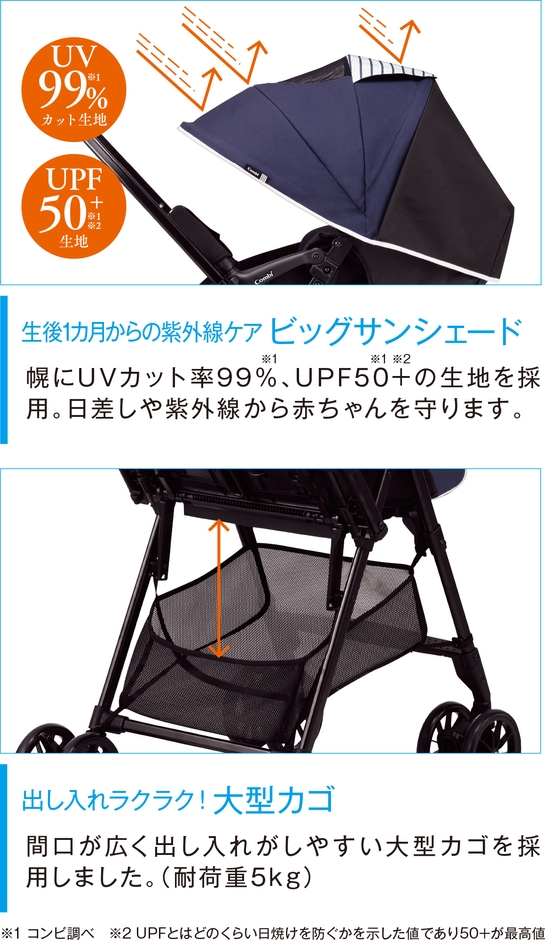 本製品は、赤ちゃんもママも嬉しい機能をしっかり装備しながら本体重量4.6kgという軽さを実現したハイシートベビーカーです。生後1カ月からの紫外線ケアを考えたUVカット率99%(※1)、UPF50+(※1※2)生地の大型幌や、地熱やほこりからデリケートな赤ちゃんを遠ざける53cmの安心ハイシート、さらに安定感のある押し心地と乗り心地を実現する「大型140mmダブルホイールタイヤ」を採用しました。