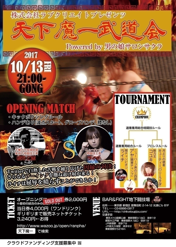 ニューハーフによるプロレスはありますが、格闘技はまだ珍しい試みです。『天下魔一武闘会』は、水元 蘭(リングネーム:ライチ)がニューハーフによる格闘技エンターテインメントとして2017年6月に旗揚げ。同月24日(土)にエキシビションマッチ「天鎌一武道会」が行われました。