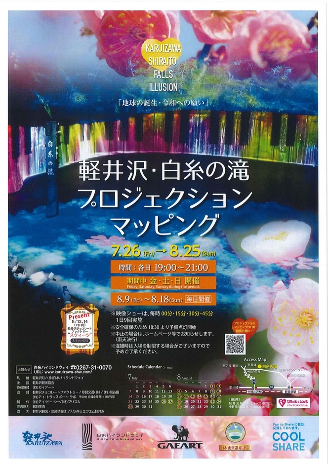 軽井沢・白糸ハイランドウェイは、夏の観光客への夜の贈り物として、8年前より光演出型のイベントを開催しております。実施場所である「白糸の滝」は上信越高原国立公園内の特別保護地域であるため、環境省へ自然公園法に基づく手続きを経て、動植物等の自然環境に悪影響を及ぼさないよう生態系調査を行いながら、イベントを開催しております。国内の国立公園内における自然物を対象としたプロジェクションマッピングは、ここ軽井沢白糸の滝でしか行われておりません。