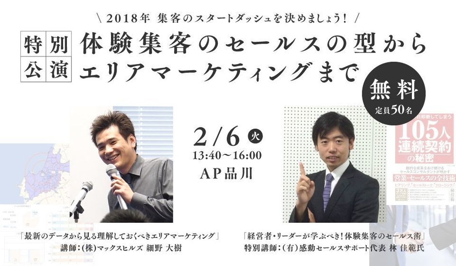 「2018年スポーツクラブ経営に役立つ集客セミナー」と題して、二部構成のセミナーを開催。第一部は、当社・細野より2015年の国勢調査などをデータを基に、エリアマーケティングの理解しておきたい点について講演いたします。第二部は、特別講師として、「105人連続契約の秘密」の著書である成約率アップのセールスコンサルタント・林 佳範氏をお招きして経営者・リーダーが学ぶべき「体験集客のセールスの型」の考え方や、今日本で最強の型と呼ばれている即日即断のセールスの型を講演いただきます。