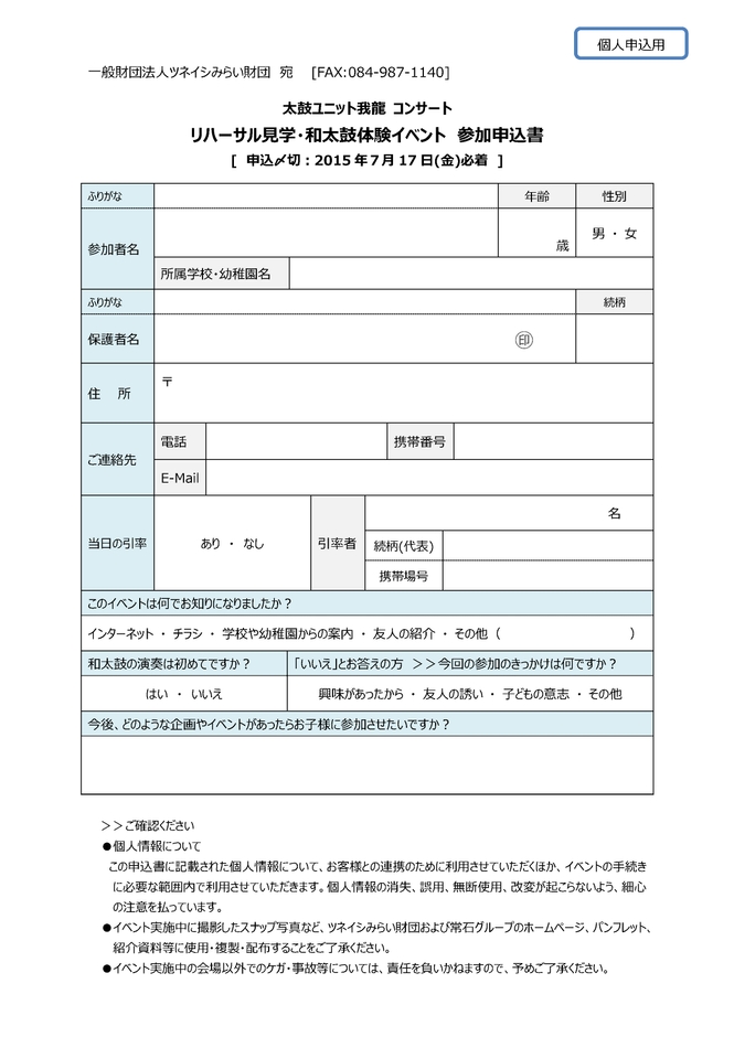 一般財団法人ツネイシみらい財団(所在地: 広島県福山市沼隈町常石1083番地、理事長: 伏見泰治)は、和太鼓とドラムを融合したユニットで広島を拠点に国内外で活躍する、太鼓ユニット・我龍(がりゅう)の10周年記念コンサートの『リハーサル見学・和太鼓演奏体験イベント』を2015年8月7日(金)に開催します。