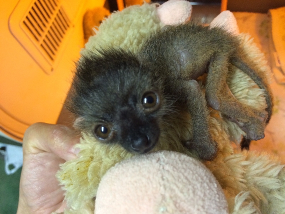 人工哺育中のブラウンキツネザルの赤ちゃん『タネ』は、2017年4月21日(金)に誕生しましたが、育児経験のない母親が自分で育てることができず、翌日には親から離れ床に落下しており、衰弱していました。そこで、飼育担当が親代わりとなり、保育器に入れて人工哺育を開始しました。開始当初、赤ちゃんの体重は52グラムほどでしたが、現在は77グラムまで成長いたしました。1日6回約3時間おきに授乳をしておりましたが、授乳量が増えたことで、体重が増加し、現在では5回の授乳を行っております。これからは徐々に離乳させつつ、外の刺激に慣らし、最終的にはブラウンキツネザルの群れに戻れるようにしていきたいと考えております。