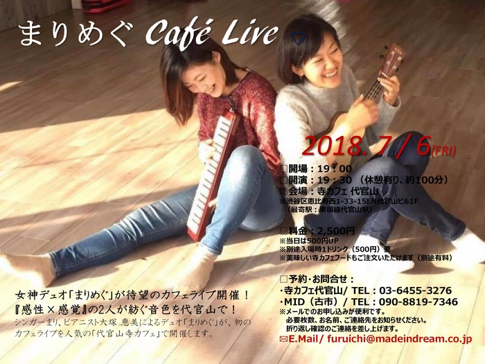 シンガーまり、ピアニスト大塚 恵美によるデュオ「まりめぐ」が、初のカフェライブを人気の「代官山寺カフェ」で2018年7月6日(金)に開催します。