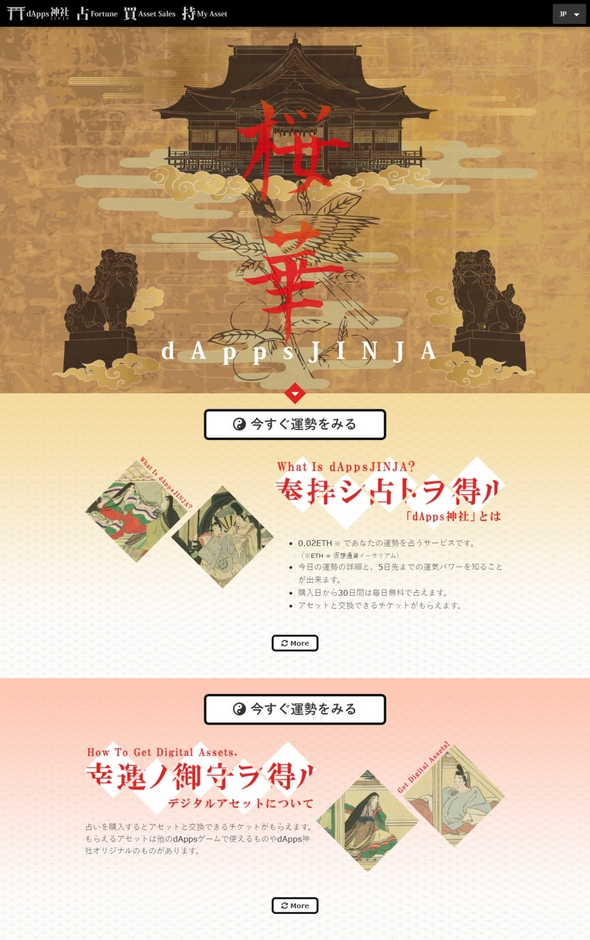 「dApps神社」は、仮想通貨イーサリアムとその根幹技術であるブロックチェーンを使ったdApps※占いサービスです。利用ユーザーは1回0.02ETH※で占いを購入すると、30日間は毎日無料で本格的な占術による占い結果を見ることができます。さらに占いのおまけとして、他のdAppsゲームで使えるキャラクター、アイテム等のアセットやdApps神社オリジナルアセットと交換できるチケットが貰えます。