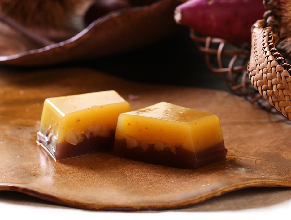 芋餡とこし餡の2層の羊羹にきざみ栗をしのばせ、ほっくりとした味わいの秋のお菓子に仕上げました。