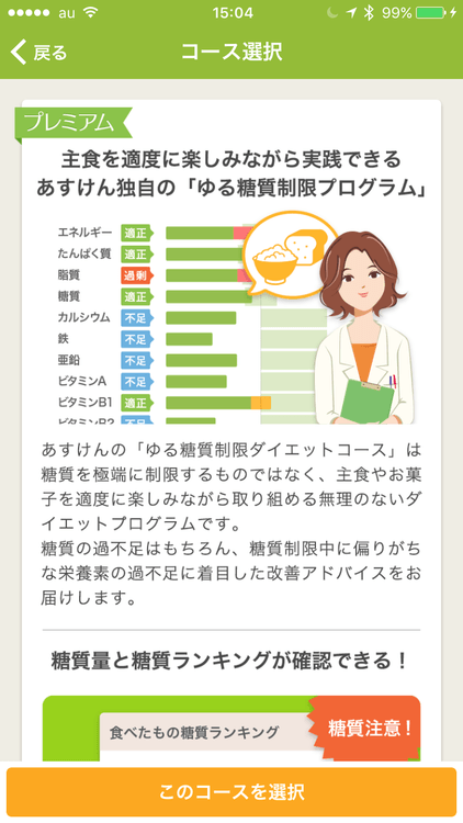 プレミアムサービスでは管理栄養士監修のアドバイスを目的別に選択できる「アドバイスコース選択機能」がご利用いただけます。中でも糖質を制限してダイエットをしたい方向けの「ゆる糖質制限ダイエットコース」が人気です。極端に糖質を制限するのではなく、適度にご飯やお菓子を楽しめるダイエットコースとなっています。