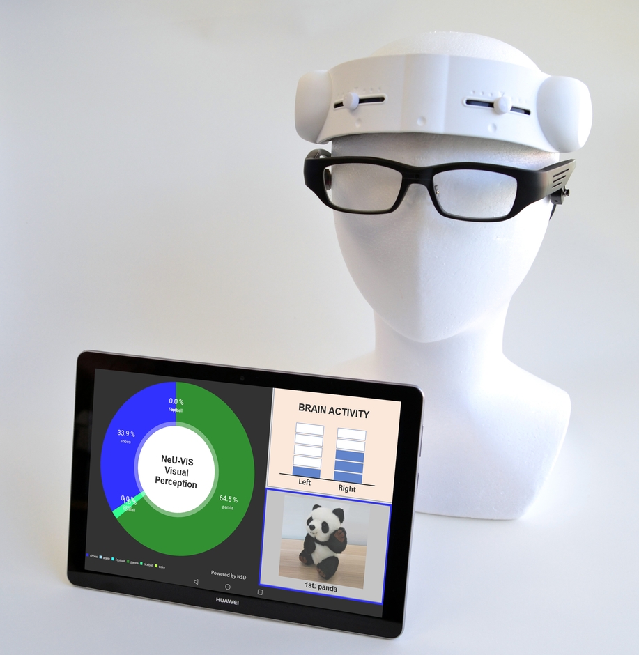 NeU-VISは、メガネ型カメラ(インフィニテグラ株式会社取扱い)、脳活動計測装置(NeU製作HOT-1000)、およびスマートフォン専用のアプリケーションから構成されています。スマートフォンでは、メガネ型カメラからUSB経由で送られた動画データを処理して、ユーザーが見ているものをほぼリアルタイムに言語情報に変換します。それと同時に脳活動データをアプリケーション上で解析し、脳活動の高低と、言語化された視認情報を一度にスマートフォンの画面上に表示するとともに、解析されたデータはスマートフォン上に格納されます。