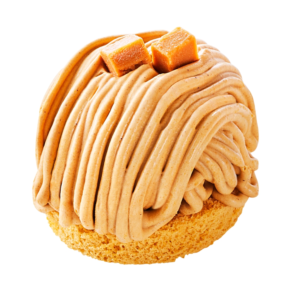 塩を利かせたキャラメルクリームのなかに、ビターなカラメルソースが隠れています。口いっぱいに広がるキャラメルのコクのある味わいはコーヒーとの相性も抜群。仕上げに塩キャラメルキューブをのせた夏にぴったりのモンブランです。