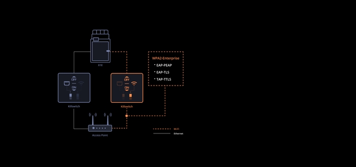 さらに、X1EはWPA2エンタープライズ認証Wi-Fi(EAP-PEAP/EAP-TLS/TAP-TTLS)に対応しており、Wi-Fiとイーサネット両方に独立したキルスイッチを装備しており、厳格なネットワークセキュリティ要件を満たします。