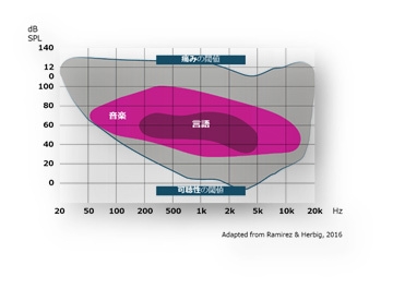 図1:人間の可聴域の周波数-強度を音声と音楽の領域にプロットして視覚化したもの。画像はLimb(2010)より引用。