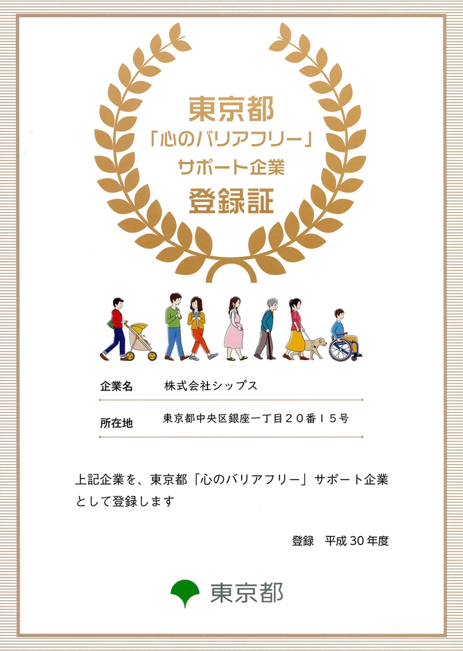 株式会社シップス(本社:東京都中央区、代表取締役社長:三浦義哲)は、東京都「心のバリアフリー」サポート企業に登録されました。